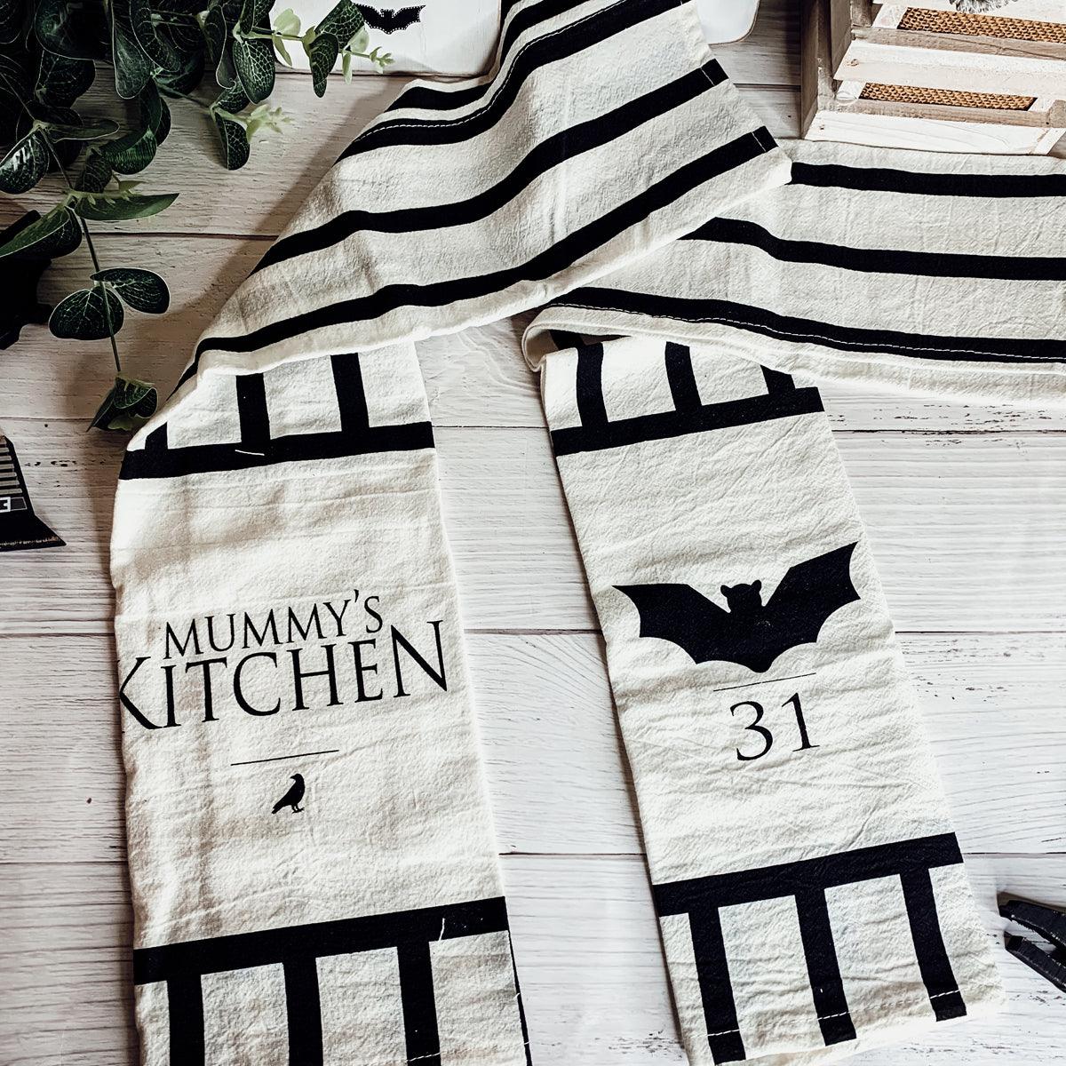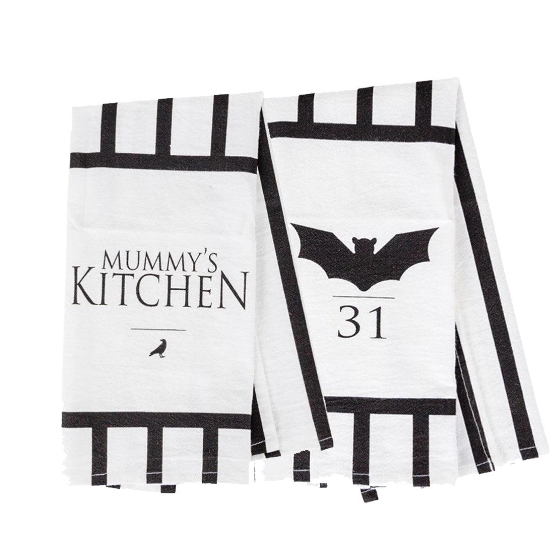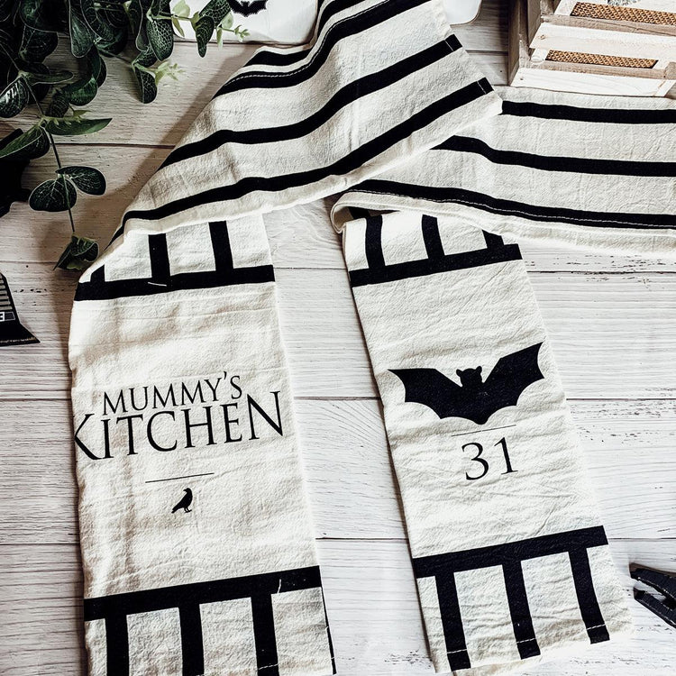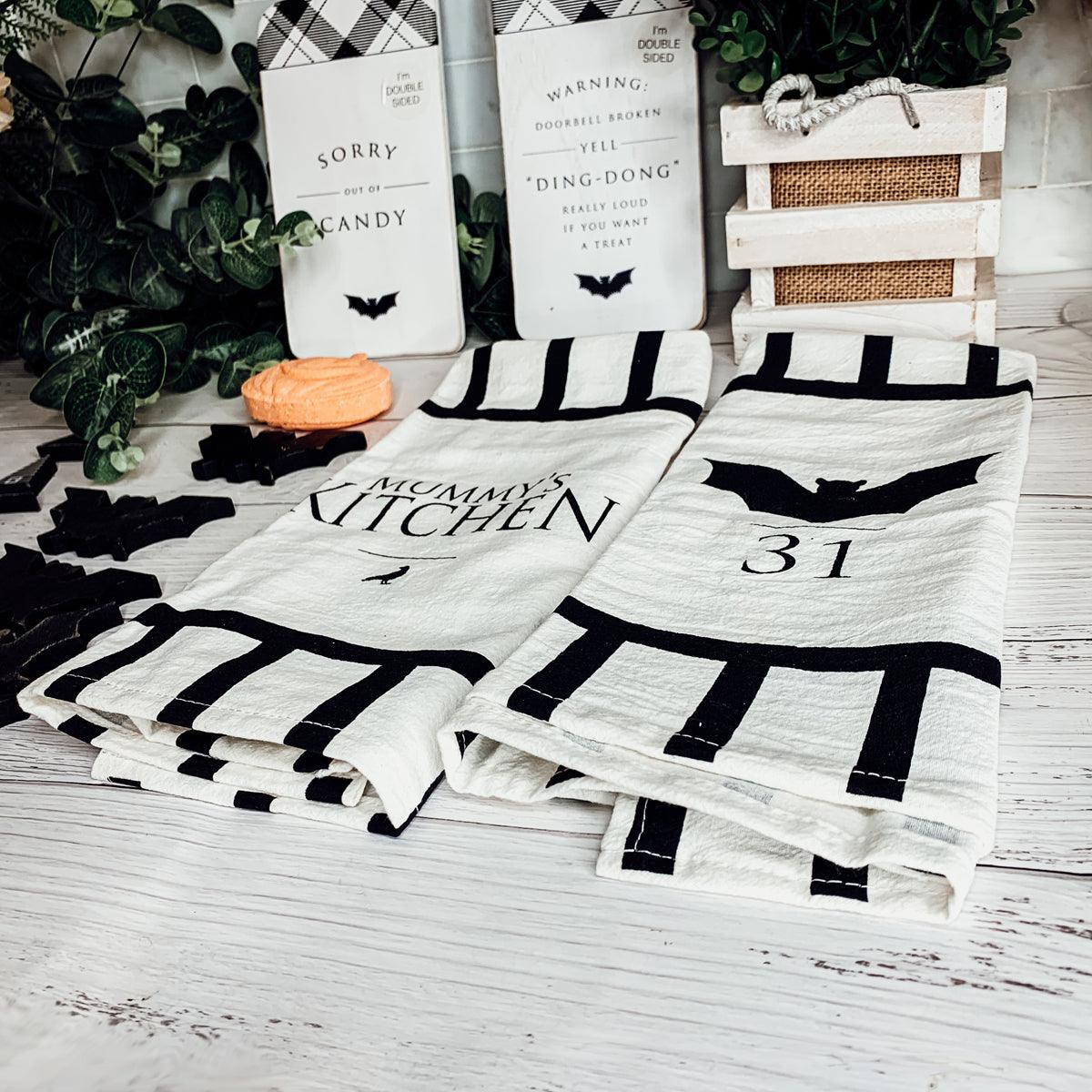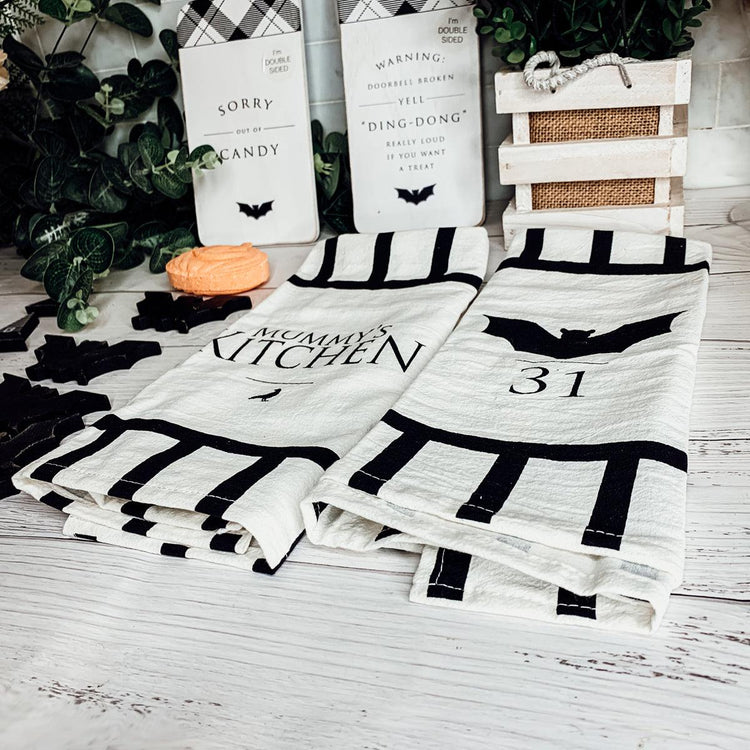 Create more excitement in celebrating Halloween by placing this dish towel in your kitchen! It comes with a versatile combination of white and black colors, and displays, "31" with beautiful stripes and a creepy bat silhouette or opt for the towel that displays "Mummy's Kitchen" on it.
