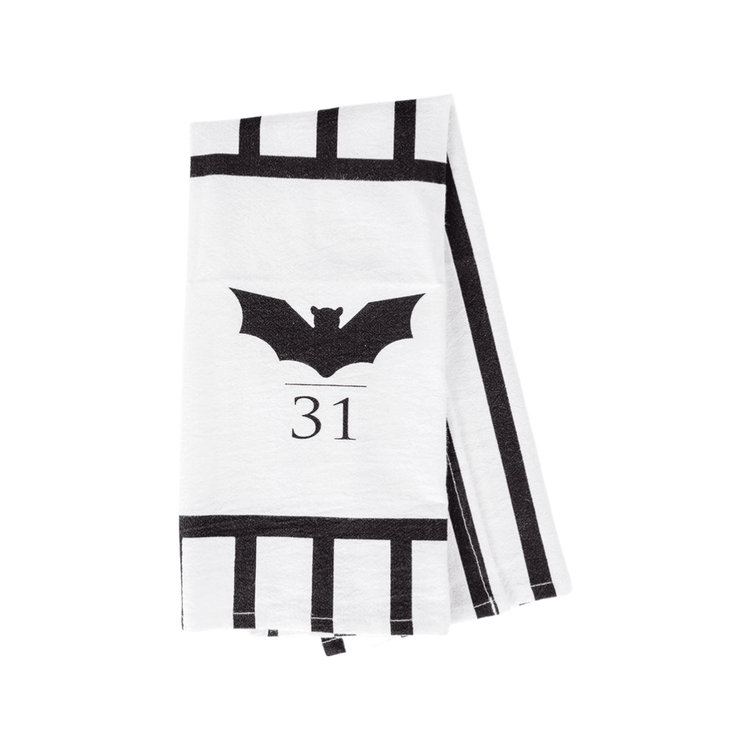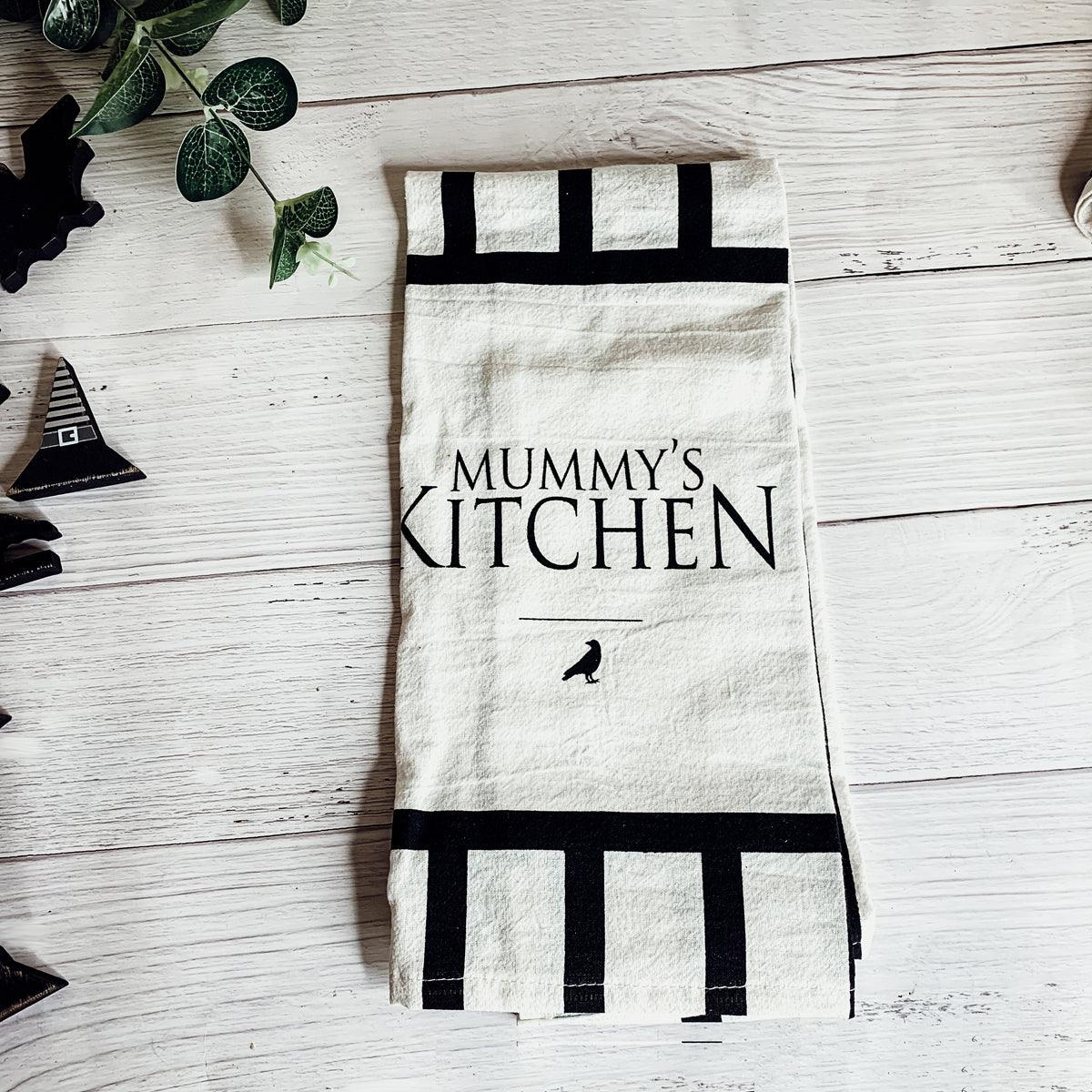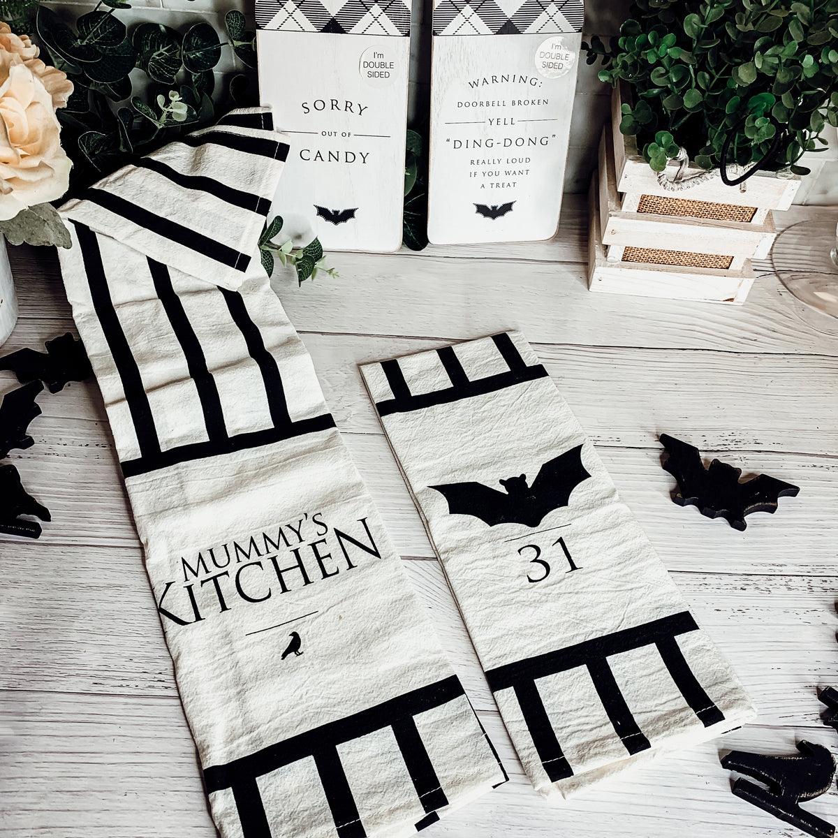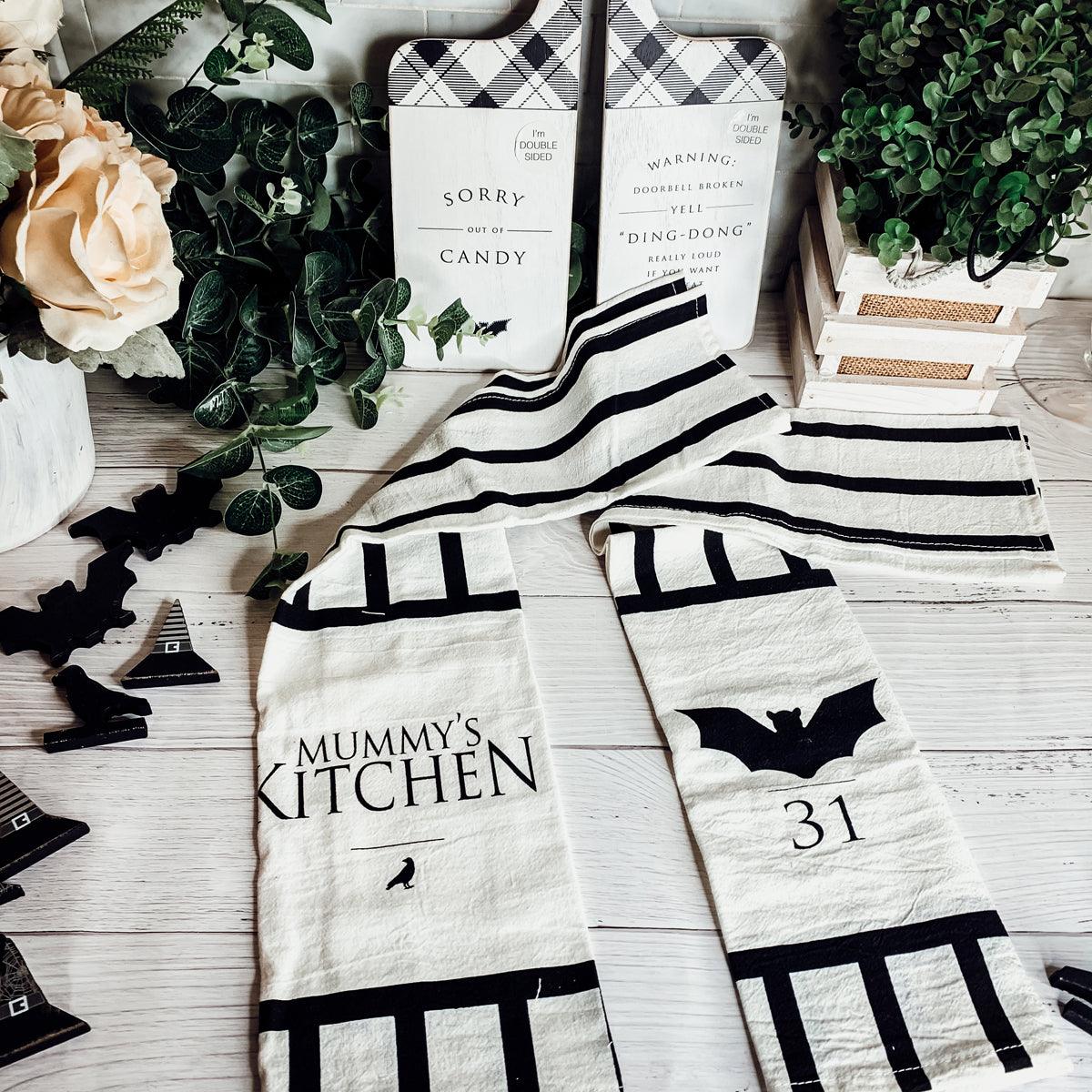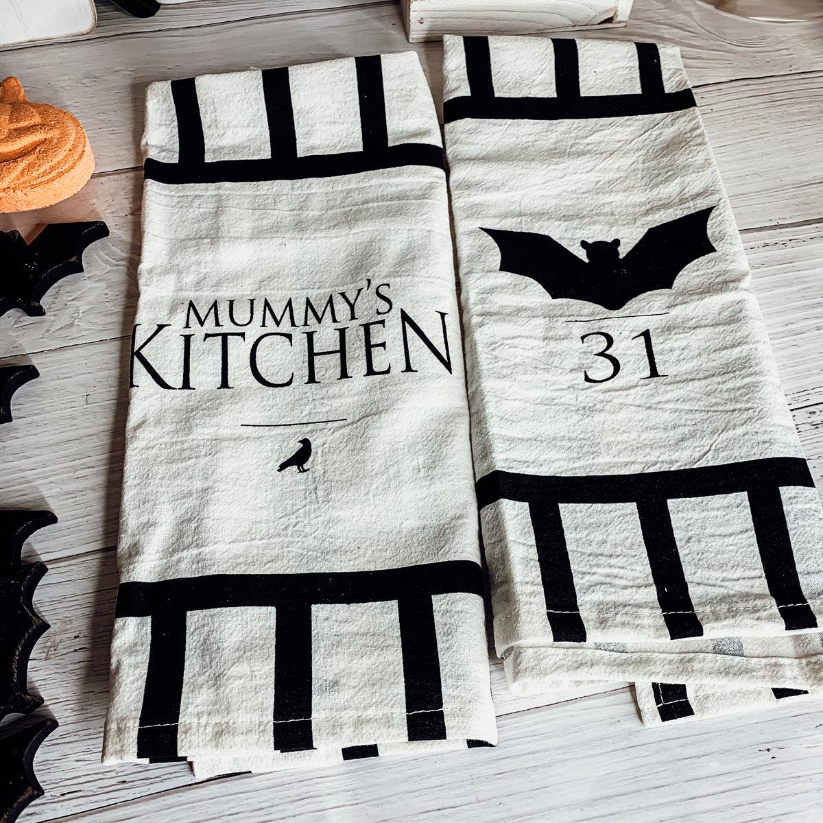 Create more excitement in celebrating Halloween by placing this dish towel in your kitchen! It comes with a versatile combination of white and black colors, and displays, "31" with beautiful stripes and a creepy bat silhouette or opt for the towel that displays "Mummy's Kitchen" on it.