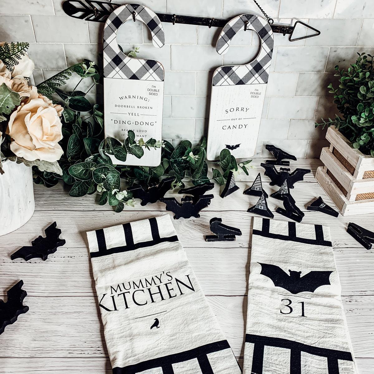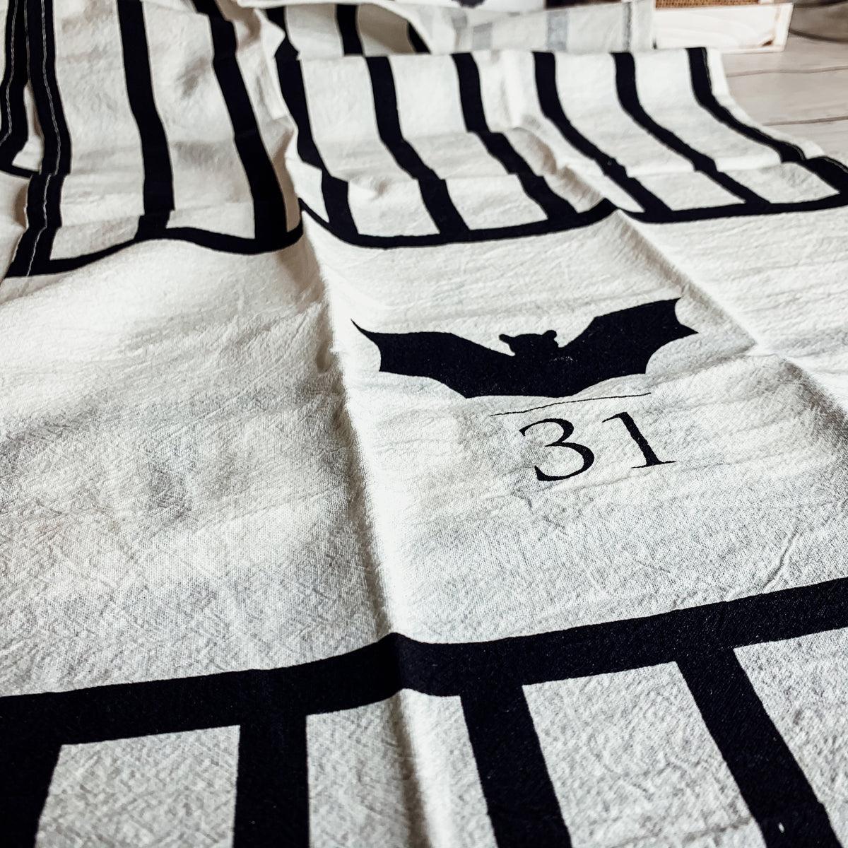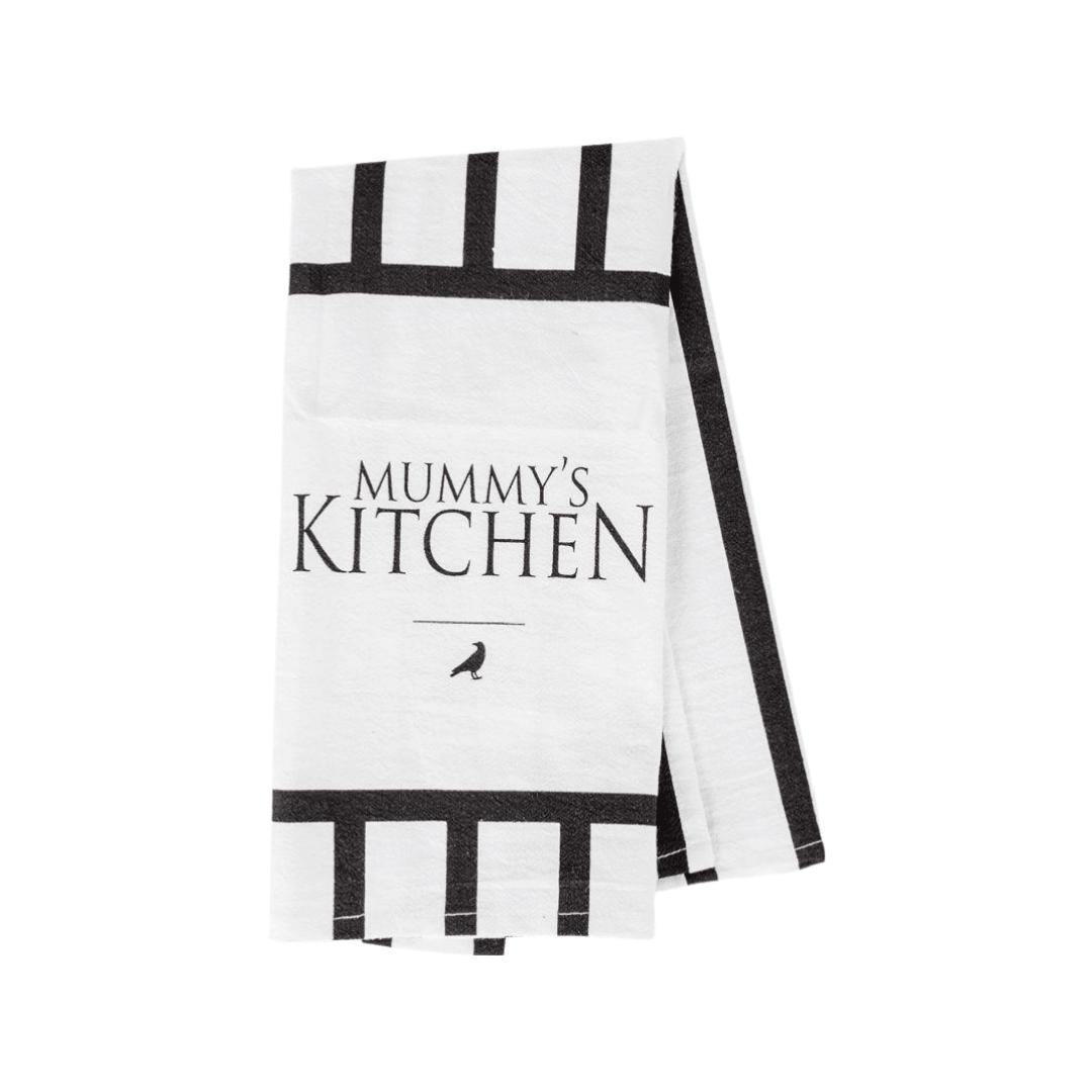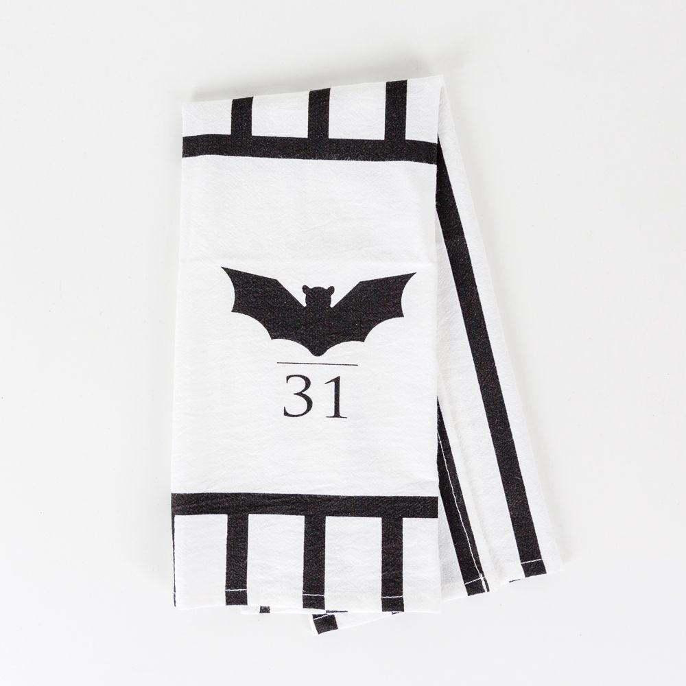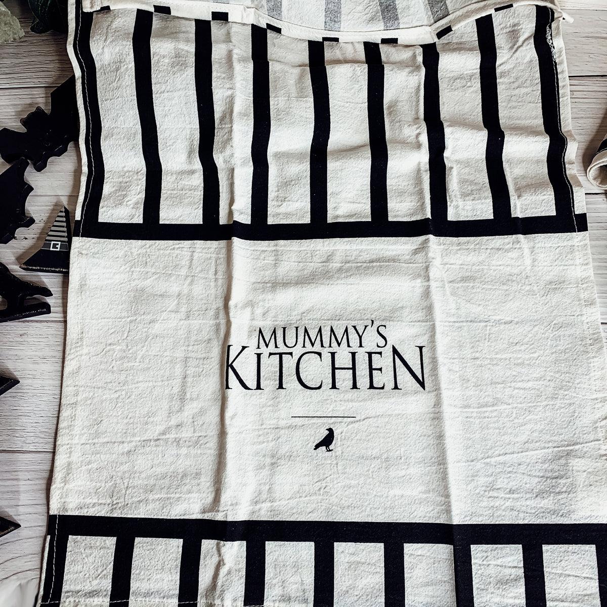 Create more excitement in celebrating Halloween by placing this dish towel in your kitchen! It comes with a versatile combination of white and black colors, and displays, "31" with beautiful stripes and a creepy bat silhouette or opt for the towel that displays "Mummy's Kitchen" on it.