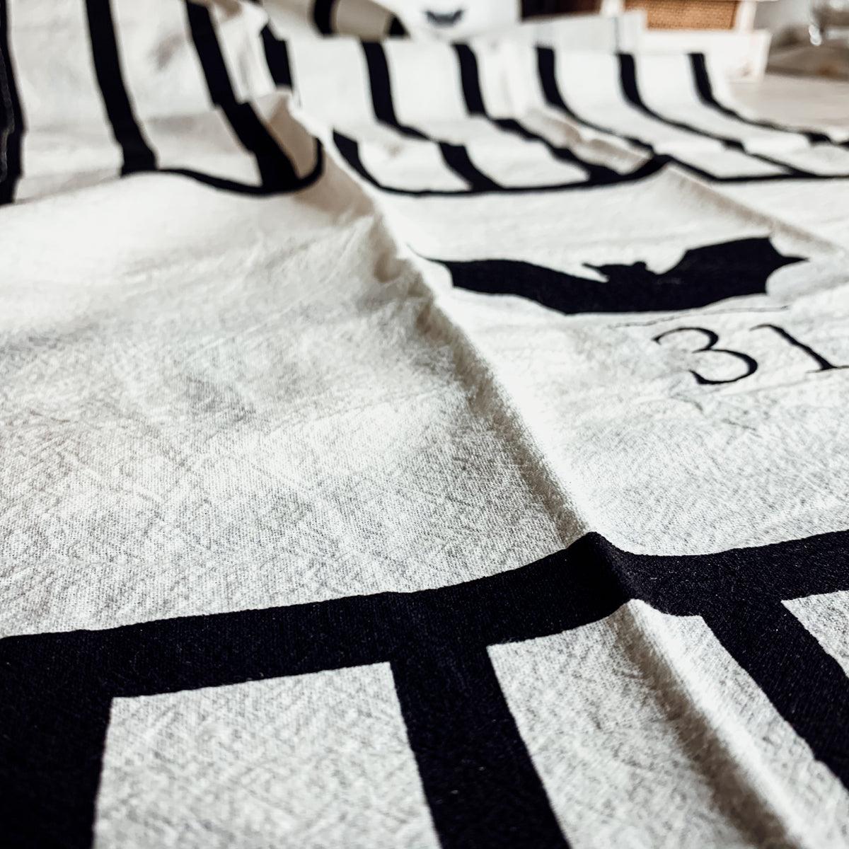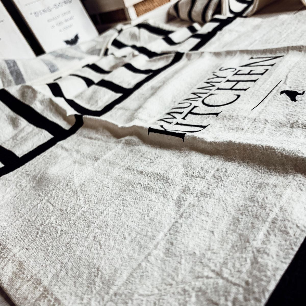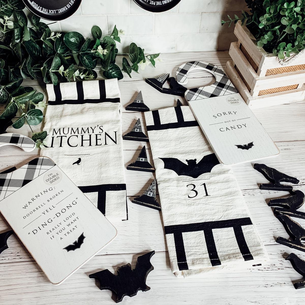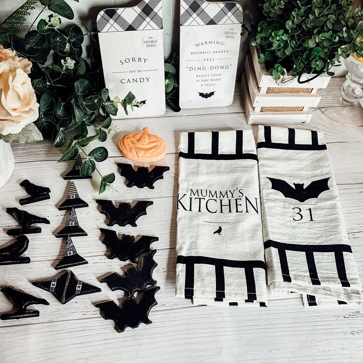 Create more excitement in celebrating Halloween by placing this dish towel in your kitchen! It comes with a versatile combination of white and black colors, and displays, "31" with beautiful stripes and a creepy bat silhouette or opt for the towel that displays "Mummy's Kitchen" on it.