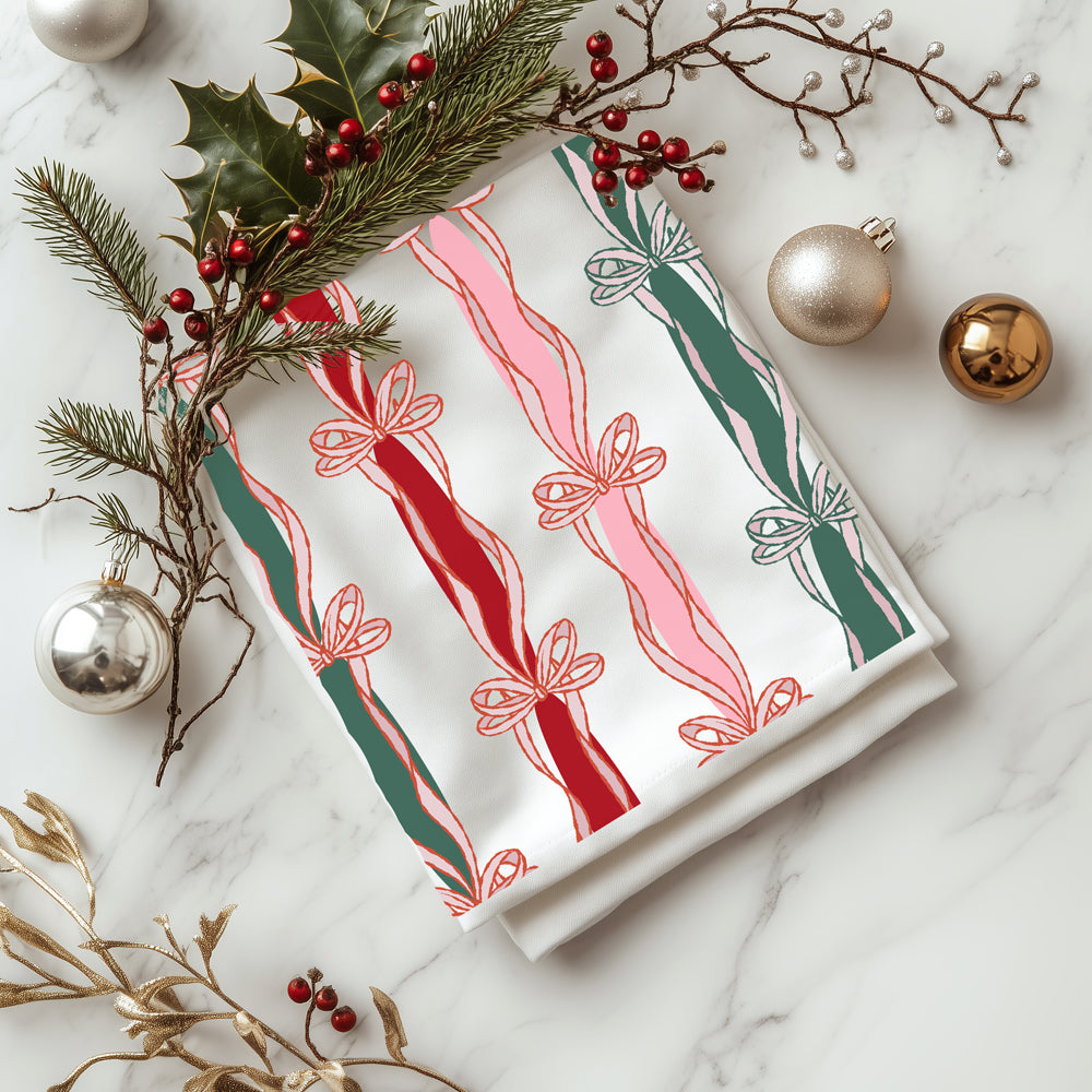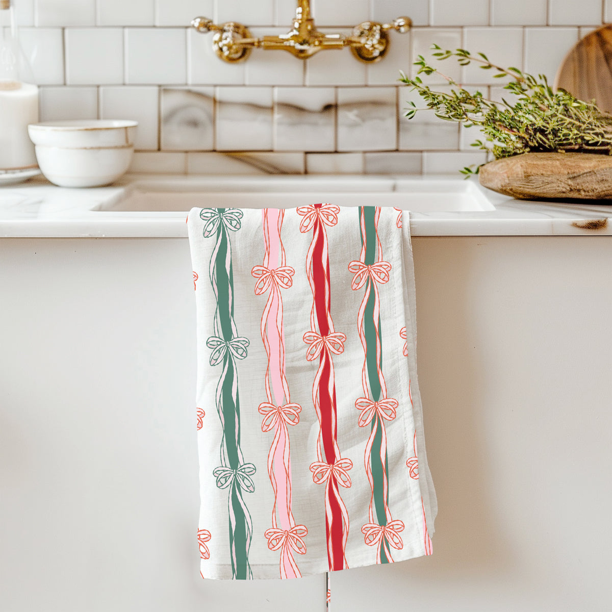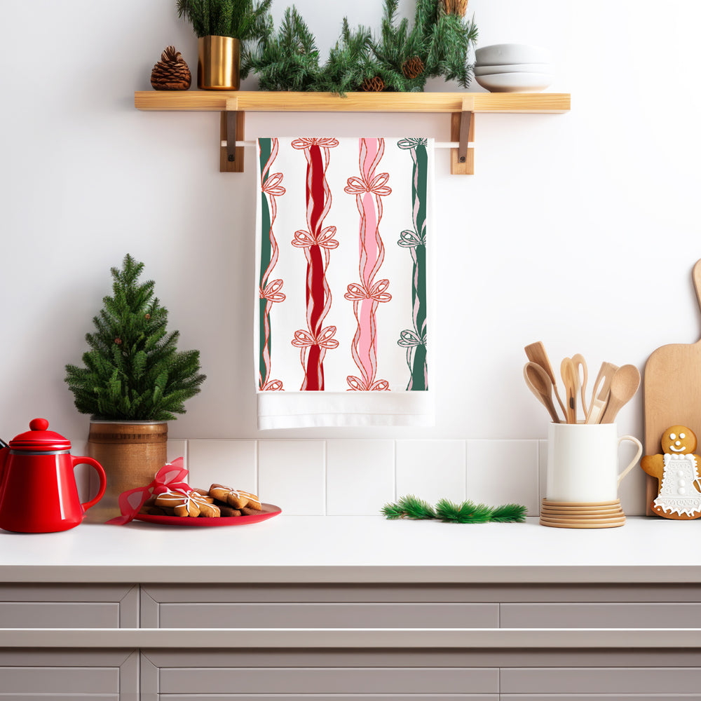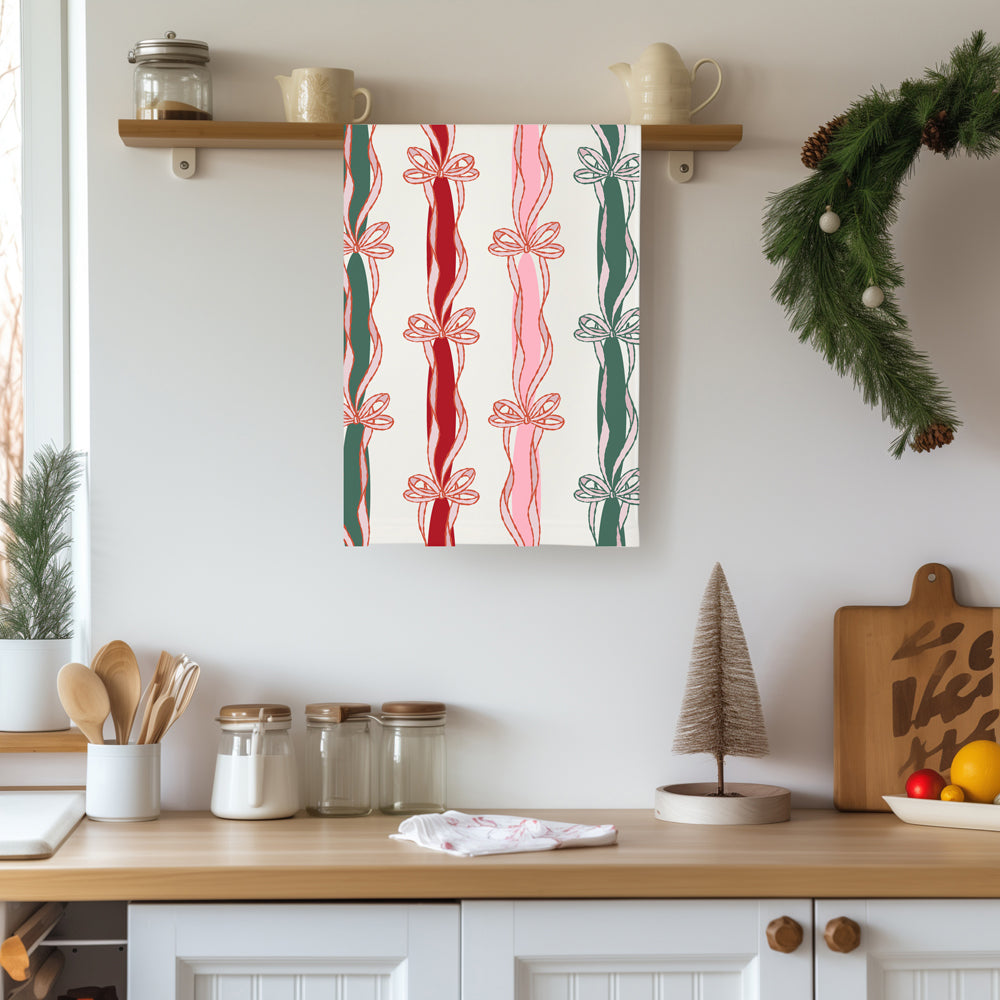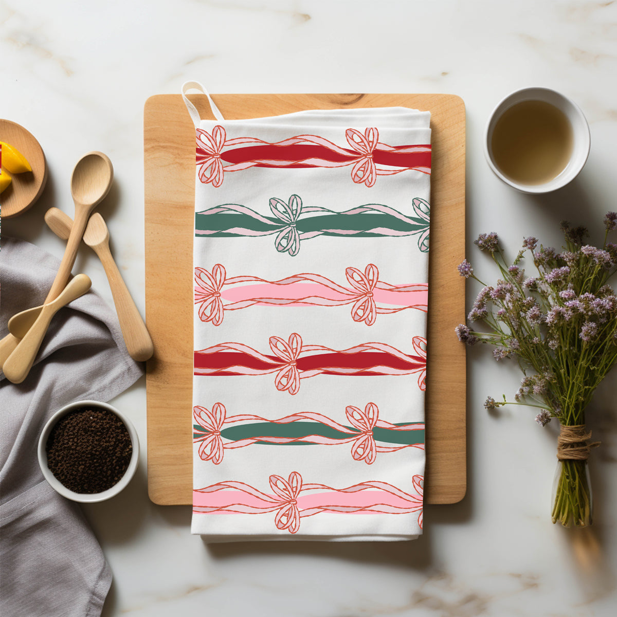 Deck the halls? Honey, weâre decking the kitchenâwith this pink, red, and green ribbon-drenched beauty that screams âIâm festive but make it flirty.â Whether youâre baking sugar cookies or just pretending to know what a yule log is, this towel is here to slay all season.