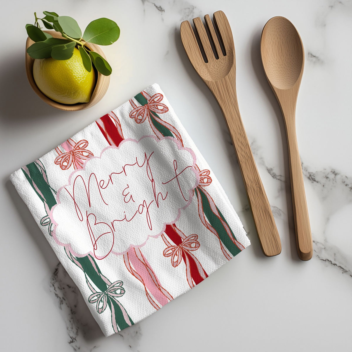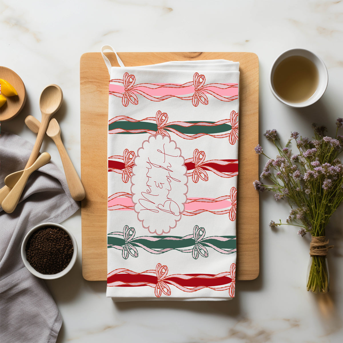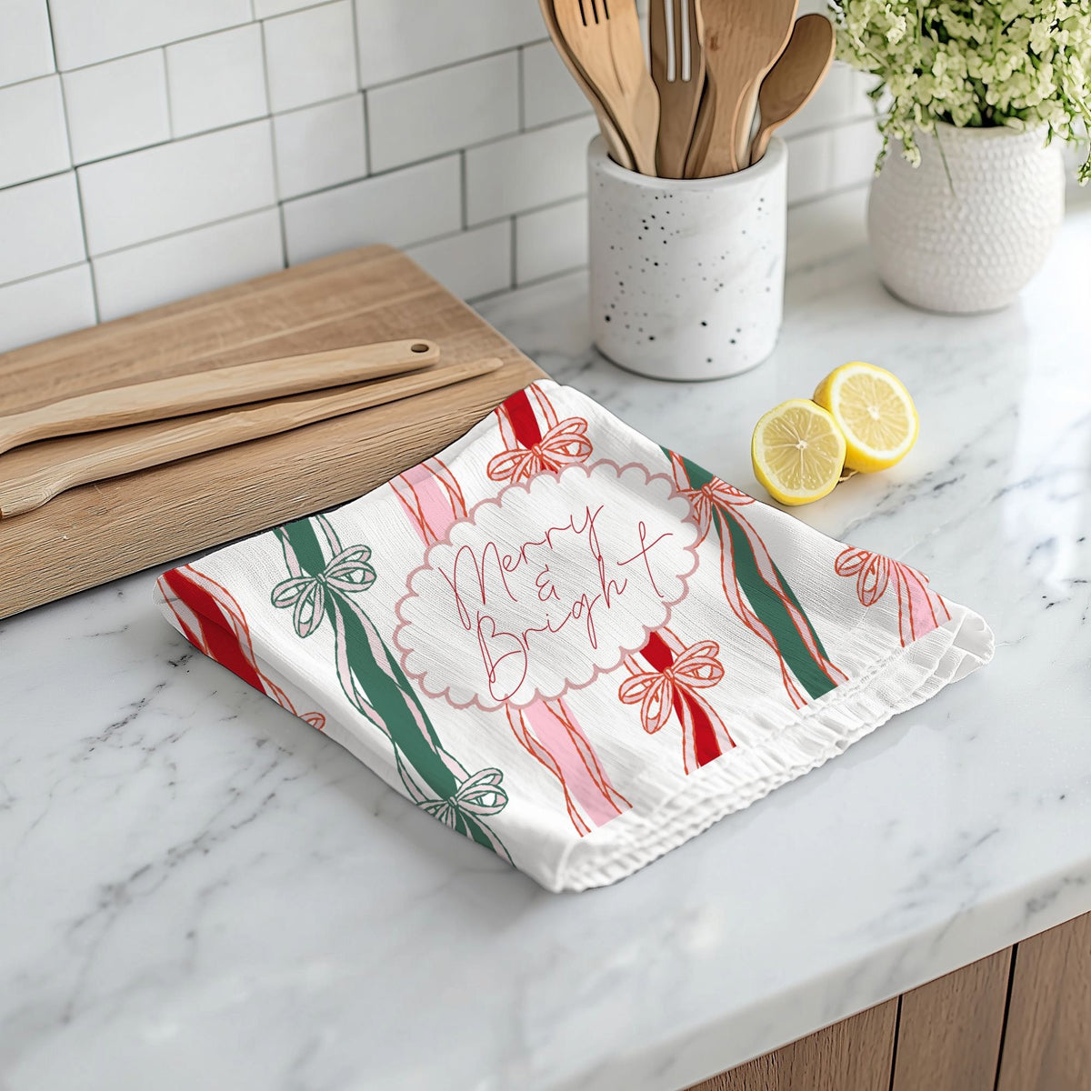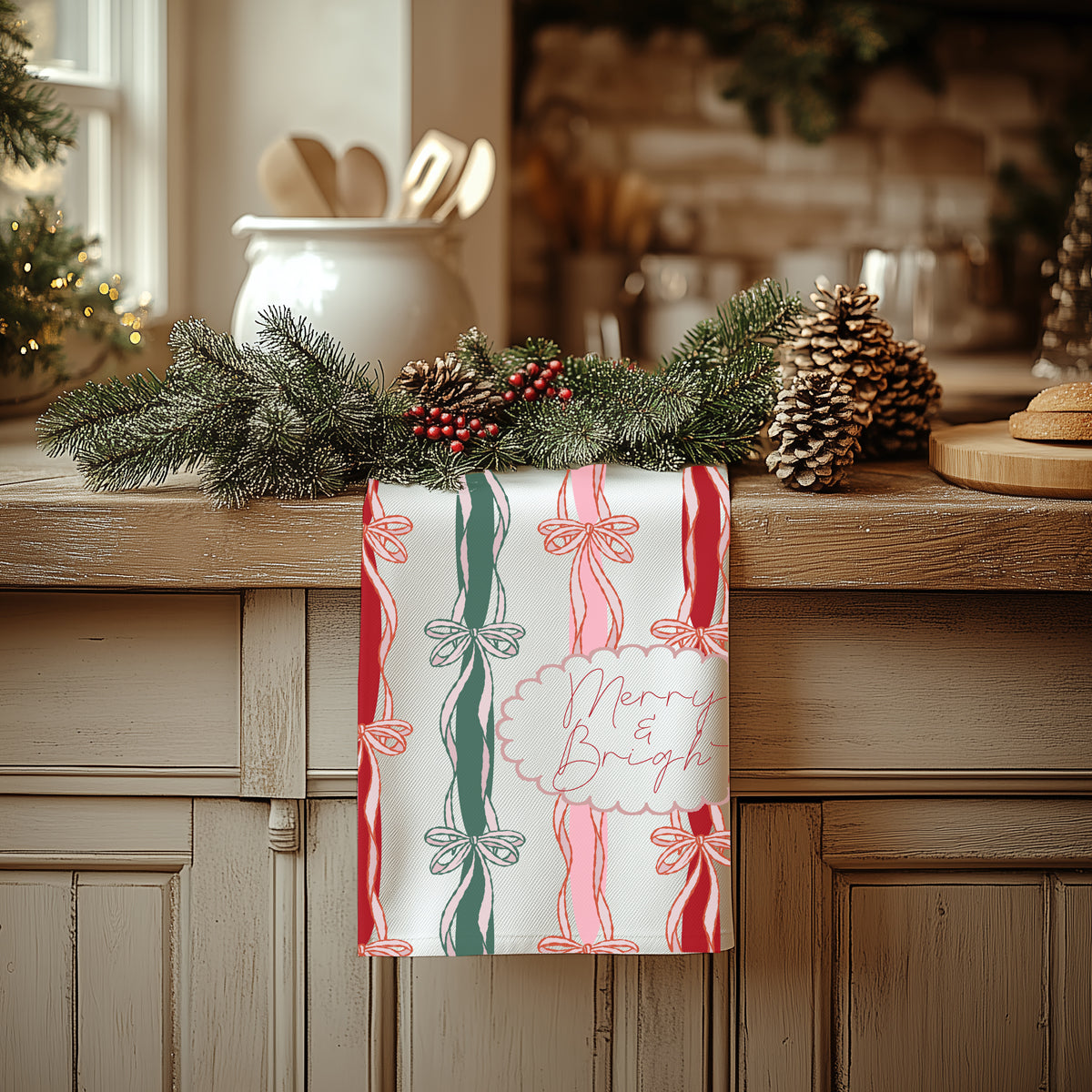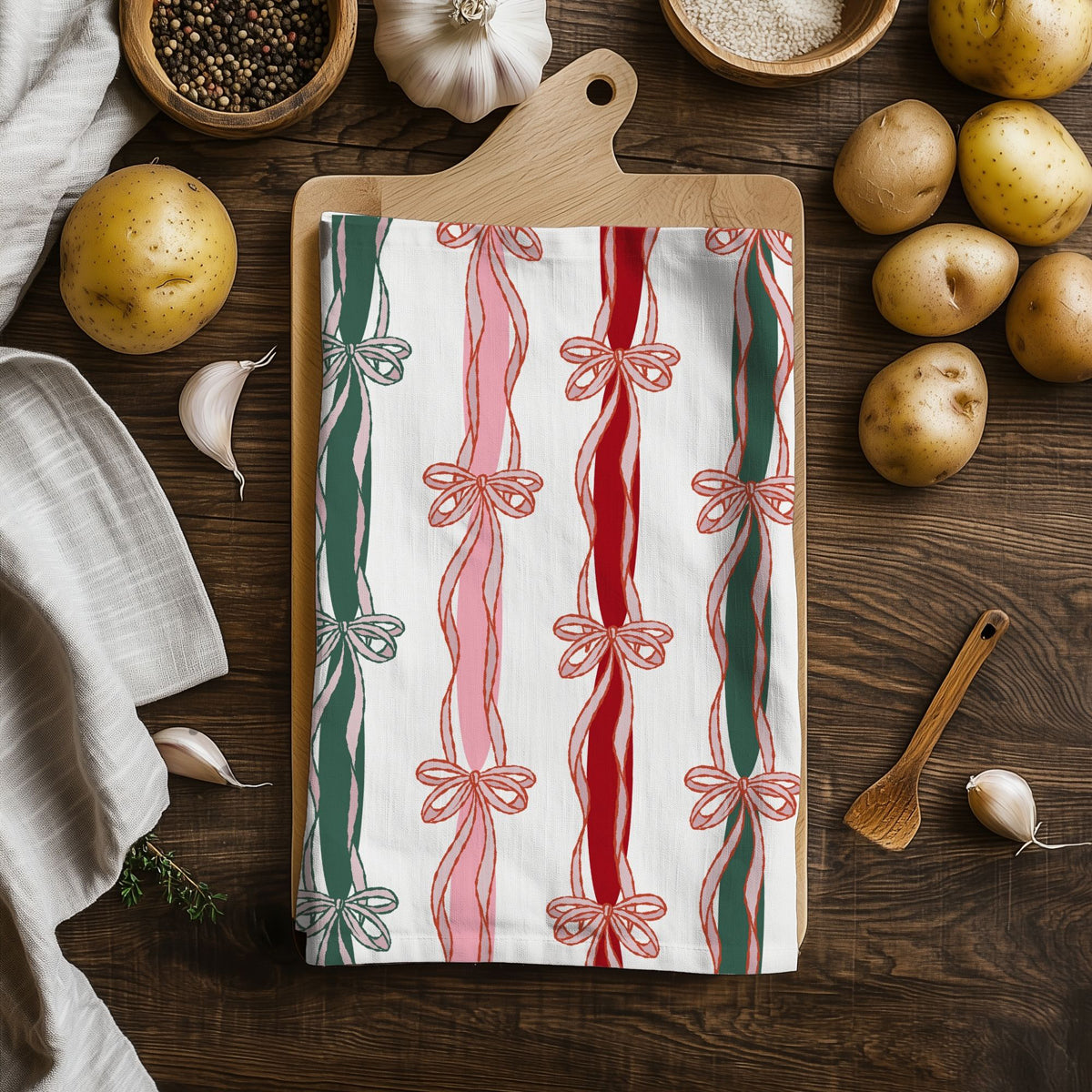 Deck the halls? Honey, weâre decking the kitchenâwith this pink, red, and green ribbon-drenched beauty that screams âIâm festive but make it flirty.â Whether youâre baking sugar cookies or just pretending to know what a yule log is, this towel is here to slay all season.