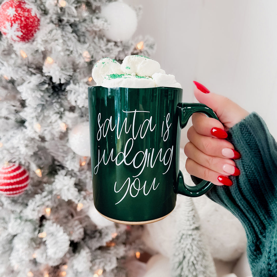 Grab one for yourself or gift it to that friend who’s always on the edge of the naughty list. Because, let’s be honest, a little festive judgment from the big guy in red never hurt anyone… right? 🎅☕